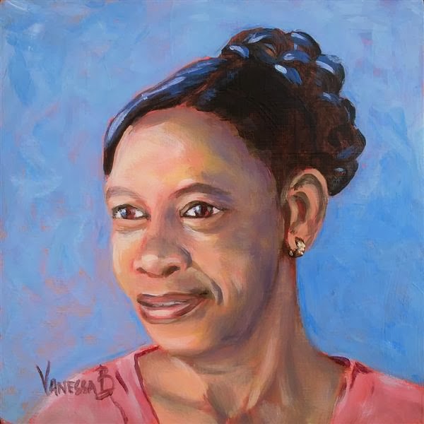 Here is my 23nd painting in the 30 in 30 challenge. I took the photo of Lindiwe and I thought this would make a lovely painting. I often use photographs as a frame of reference or a source of inspiration. Portraits are not always that easy and sometimes I don't want to aim at a perfect likeness, but more of an idea of the person. Sometimes I am surprised by the outcome. If I know the person I often find that even if I change what is in the photo, I am still met with the actual person on my canvas/board.
